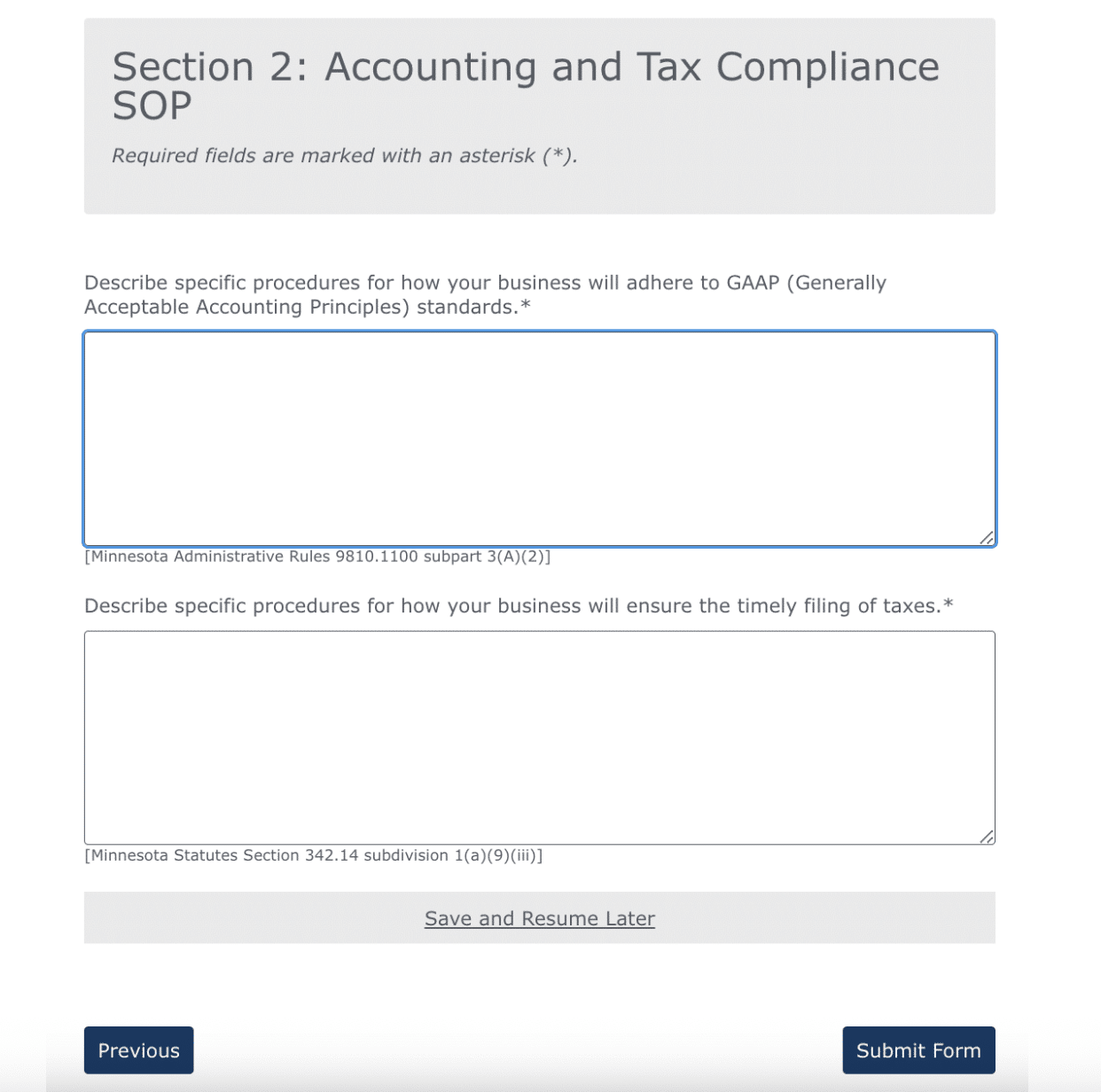 The first stage of the process was the “preliminary” stage that required a few preliminary procedures on topics such as security, inventory, training and tax compliance. Now, we are in the stage where the OCM requires “Final Plans of Record” which can be found here. In order to view all of the content, you have to enter your business name, license number and other info. We have created pdfs of the screenshots you can view instead of dealing with that hassle.